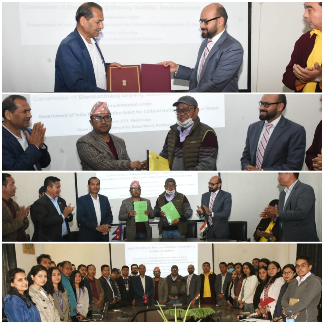 ललितपुर र सिन्धुपाल्चोक जिल्लामा थप तीन वटा सांस्कृतिक सम्पदा परियोजनाको पुनर्निर्माणका लागि भारतले नेरु २४.६ करोड सहयोग गर्नेः कार्य हस्तान्तरणथप तीन वटा सांस्कृतिक सम्पदाको पुनस्र्थापना तथा पुनर्निर्माणका लागि आज काठमाडौंमा सम्झौता पत्र र ठेक्का सम्झौतामा हस्तक्षर भयो । काठमाडौं स्थित भारतीय राजदूतावासको विकास साझेदारी तथा पुनर्निर्माण प्रभागका प्रमुख र राष्ट्रिय पुनर्निर्माण प्राधिकरणको केन्द्रीय परियोजना कार्यान्वयन इकाई (भवन) का परियोजना निर्देशकले सम्झौता पत्रमा हस्ताक्षर गर्नुभयो भने राष्ट्रिय पुनर्निर्माण प्राधिकरण र सफल बोलपत्रदाताबीच ठेक्का सम्झौतामा हस्ताक्षर भयो । सम्झौता भएका तीन सांस्कृतिक सम्पदा परियोजनाहरुमा ललितपुर स्थित जेष्ठ वर्ण महाविहार तथा सिन्धुपाल्चोक स्थित सुलीझ्याङ गुम्बा र शेरमाथाङ गुम्बा पर्दछन् । इण्डियन नेसनल ट्रष्ट फर आर्ट एण्ड कल्चरल हेरिटेज (INTACH) ले जेष्ठ वर्ण महाविहारको पुनस्र्थापनाका लागि प्राविधिक सहयोग प्रदान गर्नेछ भने बाँकी दुई परियोजनाको कार्यान्वयन केन्द्रीय परियोजना कार्यान्वयन इकाई (भवन) ले गर्नेछ ।