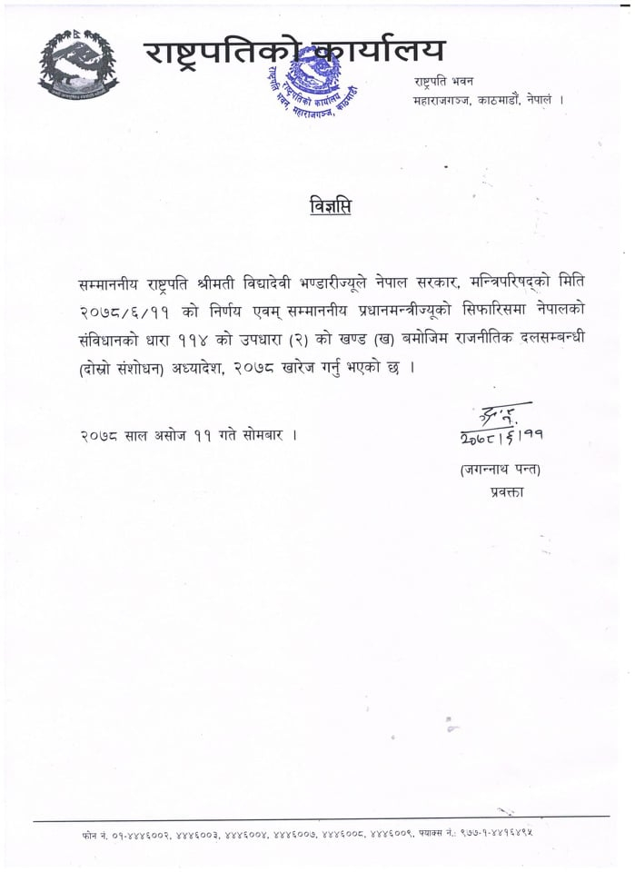 राष्ट्रपति विद्यादेवी भंडारी ने राजनीतिक दलों को लेकर अध्यादेश को खारिज कर दिया है. राष्ट्रपति भंडारी ने सरकार की सिफारिश पर अध्यादेश को निरस्त कर दिया है।सोमवार को हुई कैबिनेट की बैठक में अध्यादेश को वापस लेने का फैसला किया गया. प्रधान मंत्री की सिफारिश पर, राजनीतिक दलों पर अध्यादेश (दूसरा संशोधन) अध्यादेश, 2078 बीएस नेपाल के संविधान के अनुच्छेद 114 (2) के खंड (बी) के अनुसार निरस्त कर दिया गया है, जगन्नाथ पंत, प्रवक्ता ने कहा राष्ट्रपति कार्यालय।